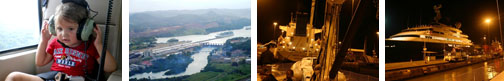 Week 9: Panama and the Canal 28-Apr-08 :: After our adventure in Belize, we flew to Panama City via El Salvador and Costa Rica. After a late arrival we spent a night in a hotel and made arrangements to join the boat on the other side of the canal. We had hoped to meet the boat in San Andres, a Colombian island off the coast of Nicaragua, but the flight was even less direct than the one we ended up taking to Panama! We ended up hiring a large helicopter to fly us over the canal to the north side. What an amazing trip! We could see everything from the air huge ships chugging across the lake between the locks, huge tracts of rainforest, and sprawling administration buildings. But the best part was the landing at Shelter Bay Marina we landed about 50 yards from where the boat was docked! We even circled over the boat as we descended and waved to the crew. The helicopter was also much faster than driving or taking the train! The following morning we set off for the "Free Zone", which is a tax free shopping district in Colon, Panama. It was hot and crowded and, although the children were very patient, our shopping was not too successful. We had been told that there were plenty of great values, but most of the shops we entered professed to sell only to wholesalers. Later that afternoon, Vaimiti was told to move to a new location near the canal entrance to await our canal pilot boarding. Finally we were gearing up to take the boat through! Our pilot was called Ramon, and he was wonderful. His father was American and he had been in the US navy, so lucky for us he spoke perfect English. He talked us through the whole journey and patiently answered any questions posed by us and the children. We finally began moving toward the first lock at about 9pm. There are 3 locks at Gatun, on the north end of the canal. Before the boat entered the lock, we took aboard numerous linemen their job was to attach ropes from our boat to the locomotives driving along a track on either side of the locks. The locomotives helped to pull the boat into the lock and, once it was there, served to keep it from moving around. The same 4 locomotives accompanied us through all 3 Gatun locks, and finally released us as we exited into the lake. But before that, we rose a total of 83.5 feet! Apparently the maximum water level, even in the wet season is 87 feet, but we are now at the tail end of the dry season and the water level of the lake is about as low as they would like it to be. Describing the experience of going through the canal is very difficult. The kids were so excited, and there was no way we could have got them into bed any earlier than 2am. We all hung out on deck, mostly toward the bow, and the atmosphere was quite festive with all the extra people on board, even though most of them spoke Spanish. It was a real thrill to enter a lock (we traveled with another, bigger boat, called Santa Lucia, in front of us) and see the door close then it was just a matter of waiting for the water below us to start to bubble, which meant that the lock was being filled with water and the boat was rising to the next level! The locks were all very brightly lit, so there was no trouble with visibility, although I'm not sure how many of our photographs came out. We cleared the last lock on the south end around 3am, and we all finally went to sleep. Since then we have bee exploring Panama City. We have been to all 3 of the well-known shopping malls, and the kids have enjoyed a final experience in a food court! Although we decided to have a higher quality meal one night and visited Benihana almost as nice as our local branch on the Kings Road in London! Click on any picture below to launch a gallery of Panama and the Canal.