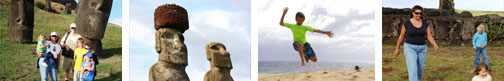 Or check out some more pics at Flickr. Week 12: Easter Island 28-May-08 :: Our flight to Easter Island (also known as Isla de Pascua) the next morning departed at 8:00am, so we had a taxi to the airport at 6:00am. Fortunately there was a coffee shop in the airport with some muffins for breakfast. The seats on the plane reclined to a completely flat bed, so everyone was very comfortable. Surprisingly, breakfast was also served on the flight. So we arrived just in time for lunch local time, and feeling rather fresh. The brand new Explora hotel was really fantastic. The rooms were simple but bright and airy, and the common areas were beautiful. The restaurant offered a set menu, but the chef was flexible enough to make an extra meal for the children if the set menu was on the fancy side for them. Wine was also included, so Daniel and I attached ourselves to a delicious organic Cabernet Sauvignon which we drank at most every meal during our five-night stay! One that first afternoon our guide took us to the quarry where the statues were made. We learned that the statues are called Moai and that they were erected in honor of leaders who died. It was believed that the spirit of the leader lived on in the Moai, which stood facing the community and looked after its inhabitants. There was also a bit of competition between clans for who could erect the most impressive (i.e. largest) Moai , making it increasingly difficult to move the Moais from the quarry to the locations where the various clans lived. On subsequent days we were shown ceremonial platforms where numerous Moais were erected and told the history of the inhabitants of Rapa Nui (as the island is known in the local language). We were lucky with sunny weather on our first and second days, but after that the rain settled in. There was a dry break where we were able to go to the top of one of the volcanoes and see the remains of the settlement that was once there. In spite of the rainy weather, we enjoyed our time on the remote island and learned a tremendous amount. Click on any picture below to launch a gallery of pics from Easter Island.