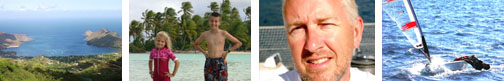 Or check out some more pics at Flickr. Week 14/15: Nuku Hiva and Tuomoto 17-June-08 :: Our first impression of Nuku Hiva, which is the main northern island of the Marquesas, was from the plane after an early departure and a 3-hour flight from Tahiti. Dusty, rocky, hot and clearly not the lush tropical paradise (see the National Geographic "Islands of the Pacific" article here). we were expecting. But apparently the only place to situate an airport was on the arid northern side of the island. Ahead lay a 2-hour bumpy ride across to the south side and the main town of Taiohae, where Vaimiti waited. A steep climb to a pass at a height of more than 1200m meant we were treated not only to cool, even chilly, winds but a spectacular view south towards verdant valleys. As we dropped down to a plateau, we found ourselves amongst fir tree forests more reminiscent of faraway Vermont than the Pacific. Several photo opportunity stops later we were in the sleepy administrative town of Tahiohae, with 1700 inhabitants, and shortly thereafter back onboard our home away from home. After breakfast the next morning we raised anchor for a leisurely 3-hour sail to a quiet bay on the north east corner. A herd of Electra dolphins accompanied us past some impressive cliff faces before arriving in Anaho Bay with majestic steep sides and deep anchorages. The bay proved very quiet with only a handful of yachts and the small resident population scattered in several structures across the broad bay. The boys and I were quickly in the water (the anchorage the previous night was off limits to swimming due to sharks ...) and immediately saw a large manta ray glide majestically beneath us! Unfortunately the coral was not of the mythical legend and we later learned that the last major El Nino had bleached the majority of coral throughout French Polynesia quelle dommage! However, on the positive side the famous NoNo's (Olympians of the sand midges) were subdued throughout our stay in the Marquesas. The following day we retraced our sail south and paid homage to Daniel's Bay, which unfortunately was not suitable for an overnight anchorage. We practiced our kayaking skills, however, and also found a lagoon fed by a fresh water river before nipping back around the corner to Taiohae Bay. Sunday was spent quietly onboard, highlighted by an excursion ashore for dinner which, due a sudden down pour, resulted in us enjoying an unexpected steak frites and rice at a roadside stall for shelter. With the prevailing winds from the southeast the southern island of Hiva Oa in the Marquesas would have to remain unexplored. After breakfast the next morning we set sail for Ahe in the Tuomoto's, 600 miles distant. With the wind blowing a helpful 20knots from a friendly quadrant we made good progress and, two relatively restful nights later, arrived inside the pass to the island atoll. Known for pearl farming Ahe treated us to a relaxing day and two nights before setting sail for the largest atoll in the Tuomotos, Rangiroa (a mere half day's sail to the east). Passing through the Tiputa pass was highlighted by dolphins following us in on the 5-knot current. Following a snorkel expedition to a nearby a moto (one of the small individual islands that collectively form the atoll) we planned our next three days of diving. The boys and dad were first up for the "sunset" dive that evening a gentle drift through the pass into the atoll in order to see sergeon fish "breeding". A heart stopping hour of clinging to coral in the strong current later the boys had completed their first recreational dive and so the die was set. Two days and 3 dives later we set sail across the atoll for the "Blue Lagoon" and the home of a breeding site for black-tipped sharks. Time for the girls to enjoy themselves in sparkling shallow waters. Only one more day was left in the Tuomoto's before setting sail for Tahiti and the much-anticipated arrival of the Grandparents from the U.K. That final day was spent experimenting on the dinghies in 15-20 knot winds, something the boys had been wanting to do for awhile. After 24 hours at sea, the peaks of Tahiti were a welcome sight! Time to pick up the grandparents at the airport and replenish the supply of food onboard. Click on any picture below to launch a gallery of pics from Nuku Hiva and Tuomoto.