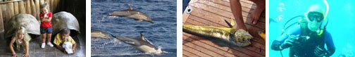 Or check out some more pics at Flickr. Week 10: Onward to the Galapagos 14-May-08 :: We left Panama City on May 1st, after refueling the boat, and headed off toward the Galapagos. The sky was hazy and the sea was eerily calm as we departed, and it stayed that way for the first day and a half. Since there was almost no wind, we ended up motoring for quite awhile. We had the fishing line out to trawl and were disappointed to catch nothing on the first day. On day two we had several bites and finally caught our first fish in the deep sea! It was a relatively small bonito, which we ate as sashimi for dinner that evening delicious! Catching the fish caused much excitement at the stern of the boat, watching Davide clean the fish and throw the guts and head overboard. Just after the excitement died down, we got another bite a good sized dorado (it's amazingly colorful, but the color dulls very quickly once it comes out of the water). As a result, our lunch consisted of a terrine of fish tartare with some seaweed. Heavenly! Day 3 of the passage was a bit windier and rougher (although the sea was not as high as some of our days in the Caribbean), so some of us were feeling quite ill. Needless to say, not much school work was done that day, and not much food was eaten. The sky remained overcast and we got some rain that day and night. By day 4 the sea had calmed down a bit and everyone was feeling considerably better. The wind was still blowing quite well, so we were making good time by sailing. The sky had cleared and it was a beautiful day, but the temperature had cooled down due to the rain! Day 5 was also gorgeous, with a lovely cool breeze and bright sky. As we neared the Galapagos, we began to notice more and more birds. Then the captain spotted 2 small pilot whales next to the boat! We didn't get a great look at them because they went below the water quickly. But then we were more alert and started noticing more and more animals. Two separate herds of dolphins swam across our path, which was very exciting at first we were watching them through the binoculars, but as we got closer to them we could see about 20 of them just swimming along and jumping out of the water! We also saw a ray sunbathing on the surface, just next to our boat. We pulled into Academy Bay at about 9pm and shortly after we anchored we received a visit from a sea lion. They love to climb onto boats in the marina and have a nap! The anchorage in Academy Bay is not very calm, so the boat swayed back and forth all night long and none of us slept very well. On our first full day, we took a water taxi (this is the normal mode of transport) onto land and walked around town. We visited the Charles Darwin Station, where research is conducted on local animals. Giant tortoises are bred in captivity and released to their natural environment once they survive their first couple of years. Since there are several islands in the archipelago, each island has a slightly different tortoise and much care is taken to keep them separate from each other. The town is very nice, with quite a few restaurants and small hotels, plus T-shirt shops galore! Later that day we took a bus with our guide, Luis, to the center of Santa Cruz Island to see the giant tortoises out in the wild. They are enormous! After that, we walked through a lava tube, which is a cave that results from the lava hardening after it leaves a volcano. Then we headed back to the boat for dinner. Wednesday, several members of the crew and Daniel went diving at Gordon Rock. They left at 6:10am and had 2 dives out at the rock formation they saw hammerhead sharks and fur seals, among other things. The rest of us went to the beach at Tortuga Bay. A small boat dropped us off in a calm, sandy bay, from which we could walk to a beautiful beach that closely resembled Horseshoe Bay in Bermuda! This was probably the first beach we've seen on our trip that rivals Bermuda beaches, except that the sand was not pink ... There is also a huge difference between low and high tide, so the beach with the waves was only safe during low tide and as the tide came in. There we saw the famous marine iguanas as they came in from the sea after feeding and swam ashore, then walked up the dunes to lay in the sun. We also kayaked in the calm bay and watched for turtles, rays and baby sharks. At the end of the day, we snorkeled in the calm bay and came across a giant sea turtle a very exciting find, and we followed him for awhile. The next day we caught a small boat out to a small island near the mainland, where sea lions were sunbathing. We waited until they got hot and wanted to splash around in the water to cool off, and then we got in the water with them and played! The surf was pretty wild there, so it was a challenging spot to snorkel, but everyone did very well. Being in the water with the sea lions was amazing! They are so curious and playful we watched about 8 of them swim down to the bottom of an underwater rock formation, go through a hole, and come up on the other side they did this over and over again, just like a toddler at a playground! After that we drove around the bay, watching blue-footed boobies dive for fish and enjoying the scenery. We got in the water again and saw another sea turtle, a marine iguana swimming, and an octopus hiding in a rock! That was a great morning. In the afternoon the boys went fishing although they didn't catch any fish they had a surprise encounter with false orcas! Even our guide, Luis, was shocked to see them so close to land. He was the first one to dive in, and the boys followed in their underwear. Hopefully one of their photos is on the website as well. The next day we moved to a hotel. After all the swaying of the boat in the anchorage, it was a treat to get a good night of sleep! Vaimiti will sail on to the Marquesas without us after our passage to Galapagos, we decided that there are better ways to use 15-20 days. So we planned an extra day in Galapagos, st