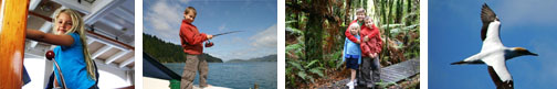 Or check out some more pics at Flickr. Week 36: Back on the South Island 10-Nov-08 :: Upon arrival in Picton, we headed back onto the water with the Cougar Line water taxi service. It took about 40 minutes to reach the Bay of Many Coves, a remote resort managed by Lisa and Mark. The sun was shining and the air temperature was quite warm, so once we settled into our 3-bedroom lodge we decided to give the pool a try! The water was actually pretty cold, so the hot tub beckoned. Meanwhile, Ben and Miranda decided to join Lisa on a walk with Poppy, her 2-year-old black Labrador. I'm sure Lisa got to hear all about Lola and Coco! The kids came back with tales of a walk to a waterfall, where they drank the water, and a helicopter landing pad. We all enjoyed dressing up for dinner and watching the sky change with the sunset. The food was some of the best we've had on the trip, which is saying quite a lot! Unfortunately, the warm weather we experienced on Tuesday disappeared and Wednesday was much colder and rainy. The kids put a little time into some school work (our agreement seems to be that on wet days they grudgingly study), and we laid low during the worst of the weather. Later in the afternoon Ben talked me into trying a walk he showed me the waterfall he'd visited the previous day and then we decided to walk up to a scenic lookout. The sign said it would be a 45-minute walk, but it must have taken us over an hour! When we reached the top, the clouds were so low that the scenic view was not even visible. Still, we felt a sense of achievement for completing the long, steep, uphill walk. That night I slept very well. Thursday the weather improved a lot, which enabled us to spend some time on the water! The kids scoffed down some cereal before Gordon picked us up in his classic cruiser at 8am, and we headed out to see Queen Charlotte Sound. He knew all the good fishing spots, which enabled us to catch a total of 20 fish. The Department of Conservation had just instituted a ban on keeping blue cod about a month previous, so we operated on a catch and release basis. However, the shags don't have to follow the regulations, so they were waiting patiently for us to release some cod straight into their mouths! Still, the kids were thrilled with their achievements we even reeled in a couple of barracudas. Gordon also had a couple of kayaks on top of his boat, so when we reached a protected cove Ben and I had a turn paddling around. There are some beautiful holiday homes along the water there, and all of them are accessible only by water taxi, since there are no roads. Gordon had us back to the resort for lunch, after which we were picked up by the Dolphin Watch tour. The agenda was to drive around in search of dolphins, then to visit an island bird sanctuary called Motuara. Although the sun was shining, it had grown pretty cold on the water! Still, it was thrilling to see some more dusky dolphins out playing in the sound, and the kids were happily snapping pictures. Arriving at the island was quite exciting, since only this boat is allowed to bring people there. Once again, the walk was up a pretty steep hill fortunately it was much shorter! When we reached the top, there were steps leading to a lookout tower with the most amazing views toward the north island. The clear skies allowed us to see for miles! The best part of that trip was the company we were very lucky to meet the Reynolds, another family of 6, traveling around New Zealand and playing hooky from school in the UK! Since we spend so much time on our own, it was a real treat to spend time with another family. We shared stories of cameras left behind, laundry and excess luggage! Friday was Daniel's birthday, so he awoke to a fresh cup of tea next to his bed and hugs from everyone. He had requested some episodes of Top Gear on DVD as a gift (which I had fortunately found in a book store in Wellington!), so he was happy. After that we reluctantly packed up our bags and waited for the Cougar Line water taxi service back to Picton. The girls spent our final half an hour playing with Poppy, since it was a lovely, sunny morning. As we sped toward Picton on the boat, Ben found something worth photographing, only to discover that his camera was not in his backpack. After searching all our bags, we had to conclude that he had left it behind at the Bay of Many Coves. We couldn't believe it! By the time the staff at the resort found it, the next water taxi had already gone past and it was too late for us to retrieve it the same day. The kids had gone to play on the playground while Daniel and I made phone calls about the camera and Daniel sorted out the rental car it was a pleasant surprise to run into the Reynolds there. It turns out that their plan was also to drive west, but the following day, so they kindly offered to pick the camera up from the water taxi office and carry it with them. We exchanged phone numbers and planned to talk about where to meet up and make the exchange. Ben was upset to be without his camera for our visit to Abel Tasman park, but relieved that he wouldn't have to wait until Christchurch to get it back (which would have been the logical place to have DHL deliver it, if the Reynolds had not offered to bring it). By the time we sorted all that out and set off from Picton, the time was nearly 2pm! With a 3 1/2 hour drive ahead of us, we resigned ourselves to only a short stop en route. As we approached Golden Bay, on the north side of Abel Tasman National Park, we encountered the Takaka Hill. After all the mountains we have visited, it doesn't sound too impressive, but the windy drive over this hill made us all feel very sick! Our rental place was a pleasant surprise the photos on the website do not do it justice, as it is a beautiful house in a pristine location. Not only is it situated just behind the dunes of Pohara Beach, with mountain views all around, but it sits on the 11th hole of the local golf course! Heaven, obviou