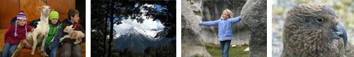 Or check out some more pics at Flickr. Week 37: Farewell New Zealand! 17-Nov-08 :: Arthur's Pass was a welcome sight after our long drive though the rain! The Wilderness Lodge at Arthur's Pass is located about 15 minutes beyond the town, on the way toward Christchurch. We settled into our interconnecting rooms and took the kids to the dining room, where a special meal was prepared for them (to leave the dining room free later for adults!). After settling them in to watch a DVD, Daniel and I set off next door for a meal with other grown-ups for a change! We enjoyed a lovely meal with 2 other American couples Jim and Marilyn from the mountains in Utah, and David and Sandra from South Carolina. Not surprisingly, the food and wine were fantastic and we stuffed ourselves with cheese cake until the kids phoned to ask where we were. After a chilly night where we snuggled up with our electric mattress warmers, the boys and I awoke early to join in the 7:30am bird watching activity. Jerry, the lodge owner and guide, met us in the reception and suggested that we all have a look at some baby pigs which he had picked up from Christchurch the previous day. As we drove over toward the farm area where the animals are kept, the wind was blowing and the clouds were low in the sky. We met the piglets, as well as a couple of young lambs, and before long snow flurries started to blow around in the air. Given that it was November, the equivalent of May in the northern hemisphere, this wasn't the spring weather we had been anticipating (but fortunately we still had our ski jackets and gloves). The flurries fell from the sky sporadically, with an occasional burst of sunshine coming through, giving us hope for improvement in the weather throughout the day. Jerry showed us where some of the local birds hang out, including hawks and falcons, and then we headed back to the lodge for breakfast. During breakfast we gave up on the weather improving, since the snow flurries became bigger and more consistent, until we found ourselves watching a virtual white out! Jerry had to cancel the scheduled canoe trip, but instead offered to take guests out to see the lambs and the calf. By the time we reached the shed, the snow was really coming down and showed no signs of letting up. The girls got their chance to hold a lamb and feed the calf a bottle of milk, which was very sweet. The wind was really blowing, but Jerry still insisted that we all see the piglets, and we watched him move a large group of sheep to a pen in which they would be protected from the wind. By the time we returned to the lodge, the snow was thick enough that the kids managed to put together a small snowman! When the snow slowed down a little bit, later in the afternoon, we headed up to the town in search of Keas to photograph. Although there were none around in town, which I gather is pretty unusual, two were waiting for us alongside the road on the way back to the lodge. The snow picked up again and made photographs pretty difficult, but the kids enjoyed being up close to the amazing birds. Another blissful dinner brought an end to Wednesday, and Thursday morning the boys and I once again joined Jerry for the early morning outing. This time is was a hike up to the arboretum on Cora Lynn Farm an uphill climb with lots of bird life and a series of trees from different parts of the world, including the Douglas Fir (which will make up a large part of our new house in Vermont!). The sun was shining and the sky was blue, so the morning walk was quite exhilarating. We returned to the lodge for a quick breakfast and got ready for our long-awaited canoe outing on Lake Pearson! Although the sun was shining, the temperature was still unseasonably cold and the wind was occasionally gusting. So Jerry prepared our canoes to launch from the far end of the lake and we set off in search of wetland birds. The paddling was sometimes quite challenging, more so than ocean kayaking! By the time we reached the near end of the lake and paddled back, we were all feeling tired and relieved to return for our picnic lunch. Our next stop was another film location near Castle Hill Village this time from The Lion, the Witch and the Wardrobe the rocks where the final battle scene was fought! Jerry knows the area quite intimately, and showed the kids and Daniel all the right places to climb. They all had a ball and were exhausted by the time we finished exploring and returned to the van. Our final dinner at the Wilderness Lodge was again delicious and we enjoyed another meal with the kids peacefully tucked up watching a DVD next door! Friday morning was another sunny one, but we skipped the early morning activity. The lodge had filled up with guests and was feeling quite crowded by this time. After breakfast, the boys and I followed the Rainbow Valley Nature Walk, reaching a couple of lookout points and being rewarded with views of Mount Rolleston and the Waimakariri River. Unfortunately, we had to pack up and depart that day, in order to drive to Christchurch for our final night in New Zealand. As we drove back toward Christchurch, we thought about how sad we were to leave New Zealand, but how we all look forward to return visits in years to come! In leaving, we began to discuss what were the highlights for each of us. Although it was a tough choice, Daniel and I agreed that our favorite place to stay was the Hapuku Lodge in Kaikoura. It was just so great to be there with Nina, Gregg and Gunnar! The kids' favorite walk also took place in Kaikoura, an unforgettable stroll along the cliffs on a gorgeous day! Daniel and I enjoyed some of the more remote walks we did near Queenstown, particularly near Glenorchy (Lord of the Rings territory!). There were also votes for the lovely Kaimata Lodge on the Otago Peninsula outside of Dunedin the setting was amazing and the wildlife plentiful. Favorite activities included whale watching in Kaikoura, scuba diving in the Poor Knights Islands (Danie