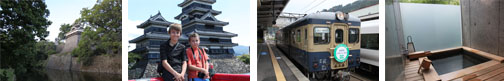 Or check out some more pics at Flickr. Quick Update 28-Sep-09 :: Just arrived in Honolulu. Sad to say goodbye to Asia but looking forward to our 2 weeks here before San Francisco. Week 81: Japanese Alps 27-Sep-09 :: We must make quite a sight, traveling around on the trains with our green, reusable shopping bags carrying our Weatabix stash for the kids' breakfasts! Never mind the fact that there are six of us and Japanese families these days tend to be very small ... But we are thoroughly enjoying the ability to move around by train so much easier than flying. Driving would be slightly more convenient, but never as quick we covered over 1000 kilometers in 7 hours on the way to Matsumoto! We awoke in Kumamoto to a very gray morning and by the time we packed up and caught taxis to the train station, the rain had started. As we rolled up toward Hakata, the clouds appeared lower and the rain really started to pour down. As we continued east through Hiroshima and toward Nagoya, the rain continued to fall and patches of fog were visible on hillsides. By the time we transferred onto the train going north, the rain was still coming down but it stopped when we reached Matsumoto, in the middle of the Japanese Alps. Sad to say, we were all excited to see Starbucks as we exited the train station, and everyone enjoyed a snack there. The taxi ride to our traditional style hotel, Kishoan, was longer than expected and more expensive too, as it is not located in the center of the town, but we were relieved to be met by Koji-san, who speaks excellent English. In addition, Hirotani -san helped us to make sure that everyone had yukatas of the appropriate size. After a long day of travel, the kids just wanted their onsen (hot spring bath) again, and a relaxing evening in the room. This was our first experience in a traditional Japanese room, with tatami mats instead of carpet, and a low table in the middle of the room. But the rooms were very spacious and located on the fifth floor, which offered us a lovely view of the mountains. We also had our own mini onsen just outside the bathroom, in addition to the common onsen on the main level, which was very nice. The kids voted for onigiri from the local convenience store again, so off I went to pick some up I surprised everyone by returning with some sushi rolls as well! After another successful and inexpensive meal, we turned in on our futons for the night. Sunday morning I awoke at 7am to a gorgeous day blue sky was framing the mountains and the air felt cool and fresh so I decided to head out for a jog. The local neighborhood is lovely, and I thoroughly enjoyed myself. When I returned to the room, the kids were up and having breakfast, and we eventually headed out to see the city. Having just missed the bus, we decided to walk into town to see Matsumoto Castle. The weather was absolutely glorious, and appreciated all the more after the previous day's rain! Walking at a leisurely pace through the neighborhoods outside the city center, it took us about an hour to reach the castle. Being a Sunday, there were quite a lot of people around to tour the castle, which was slightly less impressive than the Kumamoto castle. Although the gardens surrounding it were quite nice, in the castle itself the displays were all in Japanese, with no translations, so not very interesting for us. We made it up to the top, along some pretty treacherous stairways, to take in the view. But by the time we came back down, we'd had enough of the crowds. For lunch Daniel discovered an Irish Pub, which served fish and chips, so that made everyone happy. Matsumoto is quite a cosmopolitan place for such a small city. From there we headed over to the train station to get some information about our next trip, on Tuesday. Although most train times are available on-line, Daniel was having some trouble locating the departure times for a small train that goes through the mountains only 1 carriage long! Fortunately we discovered that the train goes at least once every hour, so putting together a trip with smooth transfers was going to be possible. We managed to catch a bus back to the hotel from there, with plenty of time to visit the onsen before dinner. Our dining area was called "Sakura" (which means cherry blossom), and we arrived there wearing our yukatas (Japanese robes). I was surprised that we had a regular table with chairs and legs, rather than a low table which enabled us to sit on the floor. But I was also relieved! Daniel and I were served about 8 courses, while the kids had about three. I really enjoyed almost the entire meal, which was a nice surprise we were both expecting to have to tolerate lots of very strange and unappetizing food. The kids did very well, trying some new things and behaving politely. Monday morning we got off to a slow start, but caught a taxi to a nearby town called Azumino, where our taxi driver directed us toward the local bike rental shop. After sorting out properly sized bicycles for all the family members, we set off for the nearby wasabi farm. I was pretty excited by the prospect of seeing how wasabi (Japanese horseradish) is grown, and riding along the country roads was complete bliss. The traffic was minimal and the signs directing us to the wasabi farm were easy to follow. After about 20 minutes of cycling we reached the place and parked the bicycles. The farm was huge, but beautifully laid out with paths and bridges, plenty of shade and cute little buildings. It turns out that wasabi grows in very wet conditions, much like a river bed, and appears to need lots of shade. The farm was so peaceful, in spite of its size, and we enjoyed wandering around the paths for about 30 minutes. Then it was off to the shop to have a look at some of the weird products, including wasabi ice cream, wasabi gummy candy, and even wasabi wine!! On the way back we rode slowly, stopping to take photos of the surrounding mountains and rice fields. After returning the cycles, we