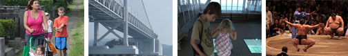 Or check out some more pics at Flickr. Week 84: Farewell Japan 19-Oct-09 :: A representative of the Anaga Hotel was waiting for us at the nearest bus station. The island is quite lovely, with tall hills falling into the sea, and the hotel villas dot a hillside, providing sweeping views of the Naruto Sound and the bridge spanning it. After settling into our rooms, the boys ran off to spend some time on the tennis court. I have to give them credit, since the temperature was significantly higher than it had been in Kyoto! I got a ride to the supermarket and bought some sushi for the kids' dinner, so that Daniel and I could enjoy a nice taster meal in the French restaurant. Given that the resort is part of Relais and Chateaux, we had high expectations. On the service end, I was surprised when the wine came and I was not offered a taste before it was poured. On the food end, some of the early courses were rather bland and possibly unimaginative, but the main course was a delicious steak served with a creative accompaniment of pureed aubergine delicious! Next morning, we headed down to the dock for a boat ride out to the bridge, where the whirlpools form. High tide was around 9:45am, so that was the peak of the whirlpools. The water is frightening so rough and fast-moving! But the boat just powers through the current without any problem. The whirlpools are difficult to describe they seem to form spontaneously due to the difference in the speed of the current and the tide, then dissolve while you're still watching. Really amazing. The boat ride was just a half an hour, and on the way back Ben noticed a huge wind farm on top of a hill behind the hotel very impressive. Upon returning to the hotel, we asked about the possibility of seeing the wind farm up close, but were told it was not possible. The staff then said we could possibly walk over the hill and get a better view. So Daniel and I took Ben and headed off along the road, which wasn't particularly friendly for pedestrians. We never did get close enough to the windmills for a good photo, though Ben stopped to set up the tripod a couple of times, and the walk was very hot and uninteresting. And, by the time we returned to the hotel, the kids were ready to play some more tennis! Daniel and I decided to have dinner on our own, leaving Ben in charge of a cereal dinner in the room again. On our final morning, the staff agreed to drive us across the bridge to Shikoku, where there is a whirlpool viewing platform on the lower level of the bridge. We packed up and checked out of our room, with the plan being to go directly from the bridge to the bus stop. So after walking the half mile to the viewing spot below the bridge, watching the whirlpools form (though the view is much better from the boat), we returned to the hotel van and headed off for the bus stop. After a few moments, the staff members informed us that they would be pleased to drive us all the way to Kobe Station, so we could skip taking the bus! What a generous offer they saved us at least 2 hours in our total travel time! The ride was absolutely lovely, since the weather was beautiful and the sky was clear. Upon reaching Kobe Station, we hopped on a bullet train bound for Tokyo. Once again, due to the holiday week, we found the train was very crowded luckily, many travelers were getting off the train at Osaka, the next stop, which enabled us to get seats together for the remainder of the ride. Our final train journey was very pleasant we will certainly miss travelling by Japanese trains. We reached the Four Seasons just after 5pm, when Daniel headed off to the steam room adjacent to the fitness center. Meanwhile, I visited the gym for a quick work out. We were trying to figure out where we could take the kids for dinner somewhere nearby, so that Daniel and I could get them back to the room and ready for bed, while we went out for a few drinks. But the kids were campaigning hard for room service, so we gave in. Once their food arrived, we set off walking in search of the office building where Daniel used to work. This is a place where he went every day for a couple of years, but of course that was 16 years ago ... Fortunately, I also was familiar with his building because the ground floor contained one of our favorite drinking places! So we didn't know exactly where we were going, but we managed to find it and remind ourselves of the building's name the Otemachi Urbanette Building, where Barclays still have all their offices, according to the building guide. So we stopped into Grand Central (the name of the ground floor bar) and it looked just the same. The faces were different, but the crowd looked the same way to make us feel old! So we had a drink and some calamari, reminisced about previous visits, then proceeded to Roppongi to check out some other old hang outs. I think we arrived a bit later than the previous visit, so some of the places were a bit more active, which was nice to see. We hit Motown briefly, then went on to Mogambo's (it was so much smaller than I remembered!). We walked around Roppongi a bit, looking for other familiar places and staying off the main road, which brought back lots of memories. Saturday it took us awhile to get out of the hotel. We finally headed out to have lunch at the New Otani, in the Trader Vics Restaurant. Well, the restaurant was pretty weird, but the sandwiches were delicious, not to mention huge! From there, Daniel took the older kids off to see the sumo tournament, while I pushed a sleepy girl around in the pushchair. From the restaurant it was a straight walk up Aoyama Dori to Omotesando, where I found Kinokuniya and bought enough Weatabix for Sunday's breakfast, plus some cranberry juice. Walking around Tokyo gave me such a great feeling, especially on a warm, sunny autumn day. The memories were really strong back in 1990 I learned my way around the city by walking everywhere (which also saved me money!), and those days were such an adven